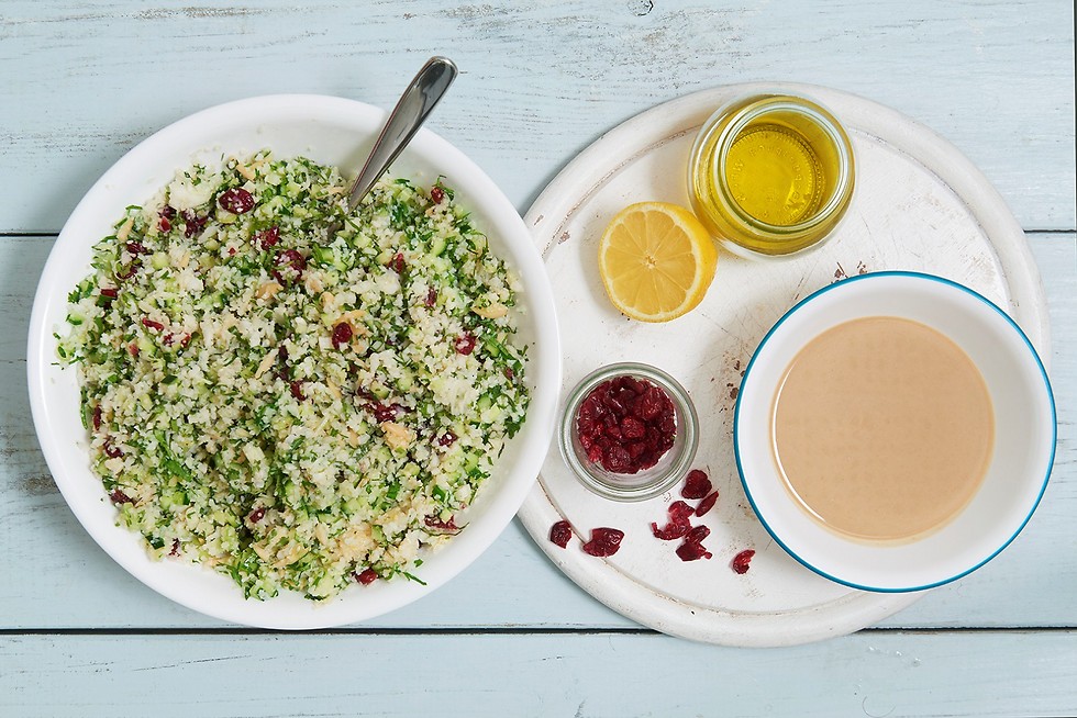 ישראל אהרוני מוכיח שאפשר להכין סלט טאבולה כרובית טעים ומשביע, נטול גלוטן, שמקבל את טעמו מהמון עשבי תיבול וקוביות דלעת צלויה.